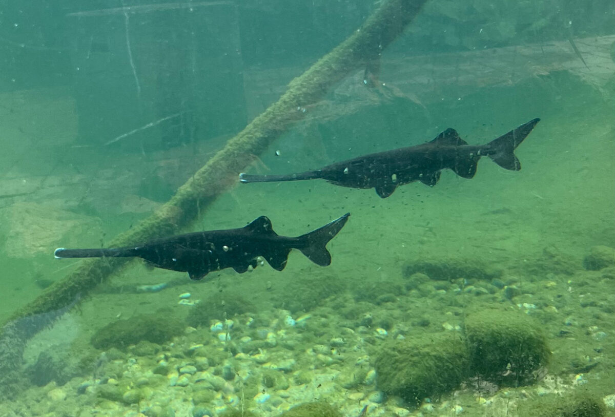 (zoo – 7.10.23) Sie werden als „lebende Fossilien“ bezeichnet: die Löffelstöre. Diese besonderen Fische schwimmen permanent mit offenem Maul und filtern kleinste Nahrungsteile aus dem Wasser.