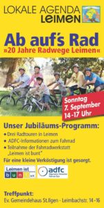 (fwu – 8.8.25) Am Sonntag, 7. September 2025, begeht die Stadt Leimen gemeinsam mit der Lokalen Agenda das 20-jährige Jubiläum des städtischen Radwegenetzes. Zwischen 14 und 17 Uhr lädt das Organisationsteam unter dem Motto „Ab auf’s Rad“ zu einem Aktionsnachmittag am Evangelischen Gemeindehaus St. Ilgen in der Leimbachstraße 14–16 ein.