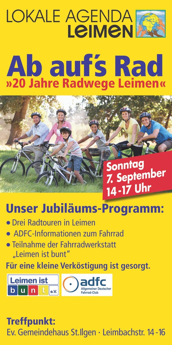Zum Jubiläumsprogramm gehören drei geführte Radtouren durch Leimen sowie Informationen rund ums Fahrrad durch den Allgemeinen Deutschen Fahrrad-Club (ADFC). Zudem ist die Teilnahme an der Fahrradwerkstatt des Vereins „Leimen ist bunt“ möglich. Für eine kleine Verköstigung vor Ort ist gesorgt.