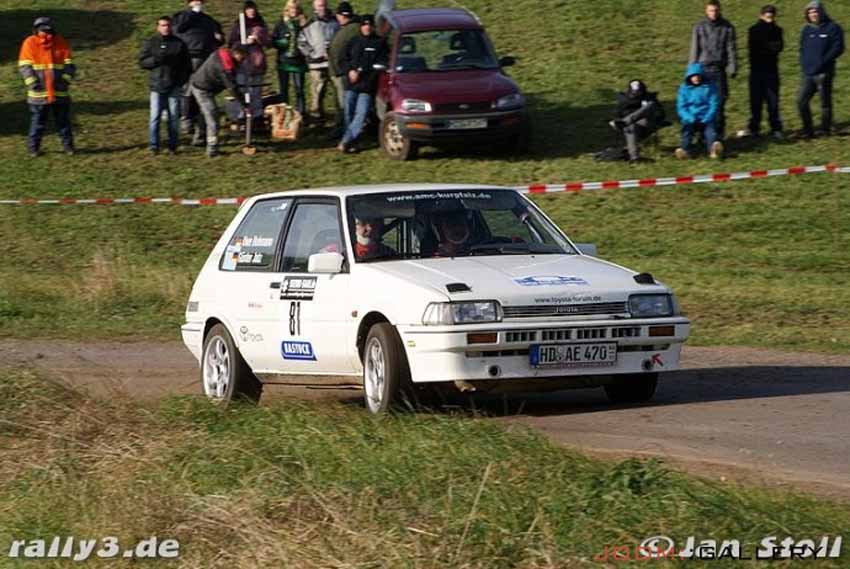(PM – AMC Kurpfalz) Uwe Buhmann wollte mit seiner Toyota Corolla bei der letzten Veranstaltung in diesem Jahr nochmal einen Podiumsplatz erreichen. Beifahrer Günter Jatz, hatte sich in 2012 leider etwas zurückhalten müssen, aber bei diesem Finale am 27. Oktober Rund um Losheim, wollte er gerne nochmal auf das Siegertreppchen steigen. Also voll Power und alles setzen was geht. Bei der Rallye „Rund um Losheim“ gingen insgesamt 88 Teams an den Start. In der Klasse N/F9 waren unter den 8 Teams auch die Sandhäuser Uwe Buhmann und Günter Jatz mit ihrer „Corolla“ zu finden. Die Wetterbedingungen? Morgens noch leichter Regen und dann immer wieder etwas Schneefall. Aber ausser der Kälte keine besonderen Herausforderungen. Der MSC Losheim e.V im ADAC hatte in diesem Jahr 2 verschiedene Prüfungen im Programm. Diese mussten zweimal, bzw. dreimal durchfahren werden. Schon bei der WP 1 gab es einige herbe Ausfälle, so dass diese letztlich neutralisert werden mußte. Uwe und Günter waren zwar voller Tatendrang, aber den konnten beide erst auf der WP 2 ausspielen. Der Rundkurs ‚“Wahlener Platte“ war so richtig nach dem Geschmack von Uwe, Günter und Corolla. Der 4. Platz in der Klasse lies Hoffnungen auf einen Pokal aufkommen. Die WP3, zuvor als WP1 konnte nach dem Regrouping dann auch gefahren werden.