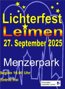 Wer schon einmal diesen Zauber erlebt hat, möchte dieses Erlebnis gerne wiederholen. Dieses Lichterfest ist klein, mitten im Herzen von Leimen und sehr romantisch. Mit viel Fantasie werden tausende Lichter in schönen Formationen aufgestellt und leuchten in allen möglichen Farben bei Einbruch der Dunkelheit. Bunte Lampions hoch oben in den Bäumen runden das Bild ab. Es gibt auch viele Sitzgelegenheiten und so ist auch ein längerer Aufenthalt angenehm. Für Essen und Trinken ist reichlich gesorgt. Auch an die Vegetarier ist gedacht.