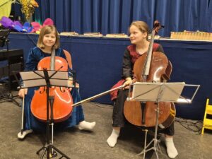 Die wunderschön verkleideten Kinder der musikalischen Früherziehung besuchten zur Cellomusik von Lena Decker und Rebecca Fuhrmann den Wunschbrunnen und auch die heiratslustigen Prinzessinnen (Merle Götz, Johanna Fuhrmann, Rhea Haase, Matea Sperl, Mara Killian, Josephine Vetter) warben aufs Feinste herausgeputzt und aufgetakelt um einen Kuss des Frosches.