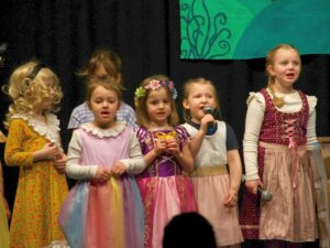 Am Ende der Vorführung bat Frau Fuhrmann alle Kinder nach vorne zur Bühne und es erklang das Lied „Wir sind Lichterkinder“. Die Strophen wurden gekonnt von Lena Decker, Lena Anselmann, Leela Merkel, Anna Linn Bitzer und Rebecca Fuhrmann vorgetragen. Alle – Mamas, Papas, Omas und Opas – sangen begeistert mit. Nach den Dankesworten gab es zum Abschluss ein großes Schlossfest und es wurde zum gleichnamigen Lied von Nilsen gemeinsam getanzt.
