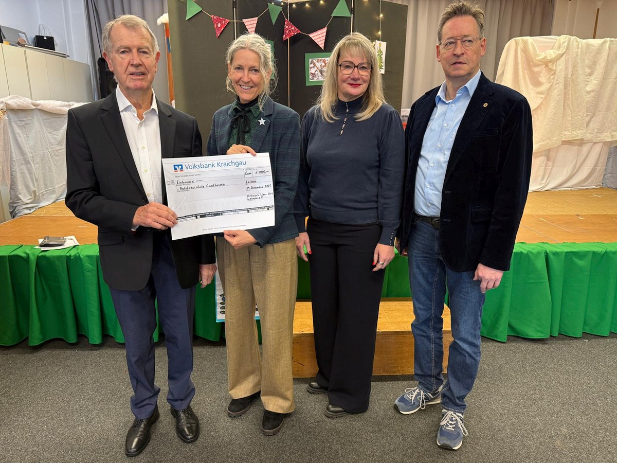 Die feierliche Spendenübergabe fand im Rahmen der jährlichen Weihnachtsfeier der Schule statt. Die Schülerinnen und Schüler gestalteten ein stimmungsvolles Programm mit einem kleinen Theaterstück und gemeinsam gesungenen Weihnachtsliedern auf der Bühne. In diesem festlichen Rahmen überreichte der Schatzmeister des Lions Club Leimen, Heinz Thoman, den Spendenscheck an die Rektorin der Pestalozzischule, Frau Senzig. Anwesend waren zudem der Präsident des Lions Club Leimen, Stephan Walter, sowie Ute Blessing.