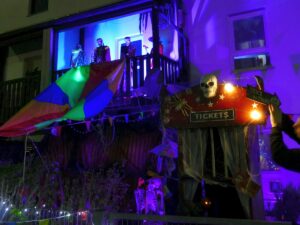 Das Motto zum Jubiläum ist dieses Jahr der „Bloody Circus“. Und der Name ist Programm. Schon am Gartentor hängt ein Schild mit „Tickets“ und einem Totenkopf obendrauf. Wer sich hier anstellt, bekommt keine Zuckerwatte, sondern Gänsehaut. Zwischen Spinnweben und flatternden Planen schaut ein Skelett mit Regenschirm über das Geländer, daneben posiert ein zweites im Glitzerkostüm – der Tod hat schließlich auch Stil.