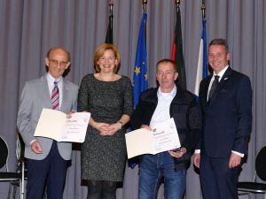 Einen nicht im Programm stehenden Punkt übernahm dann Oberbürgermeister Reinwald im Anschluss, als er die Herren Gerhard Mayer mit der Stadtmedaille in Gold und Herr Michael Helffrich mit der Bürgermedaille in Gold auszeichnete. In seiner Laudatio würdigte der OB die beiden Geehrten. Gerhard Mayer kümmert sich seit vielen Jahren ehrenamtlich um das beliebte Leimener Wildgehege. Er befüllt die Futterautomaten, versorgt dort auch am Wochenende die Tiere, kümmert sich um Kranke und leistet im Notfall auch Geburtshilfe. Durch sein Engagement, sein Fachwissen um den Wald und seine große Erfahrung im Umgang mit den Tieren sei er für die Pflege und den Betrieb des Wildgeheges unverzichtbar. Daher freue er sich, Herrn Mayer heute mit der Stadtmedaille in Gold auszeichnen zu dürfen.