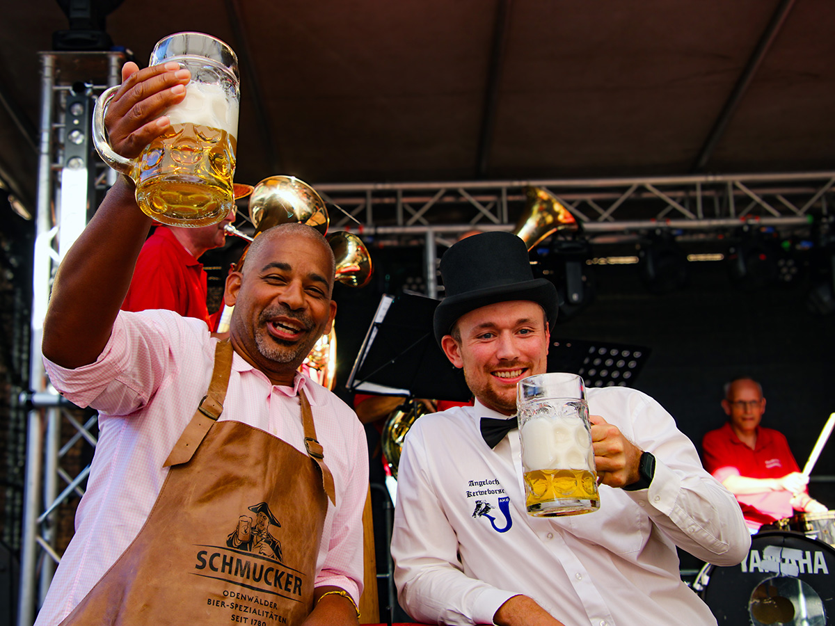 (ckr – 1.9.25) „O’zapft is!“ hieß es am Wochenende auch im Leimener Ortsteil Gauangelloch. Nachdem am Freitagabend schon traditionell in der „AKB Pumphaus Lounge“ gefeiert wurde, übernahm Oberbürgermeister John Ehret am Samstag den Fassbieranstich zur Eröffnung der Kerwe – und brachte das Kunststück mit nur einem Schlag hinter sich. Vorher warnte er die Zuschauer und Zuschauerinnen in der ersten Reihe vor den obligatorischen Tropfen, die jedoch gänzlich ausblieben.