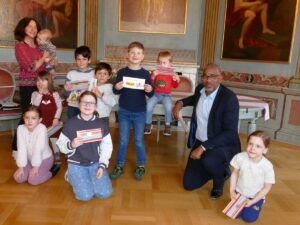 So war auch ein besonderer Höhepunkt, auf den sich Oberbürgermeister John Ehret persönlich sehr gefreut hatte, die anschließende Ehrung der jungen Gewinnerinnen und Gewinner. Er überreichte den Kindern Gutscheine des lokalen Fachgeschäfts Spielgut am Georgi-Marktplatz. Damit unterstrich das Stadtoberhaupt auch die Verbundenheit zum örtlichen Einzelhandel, der von einer attraktiven Baustellengestaltung besonders profitiert.