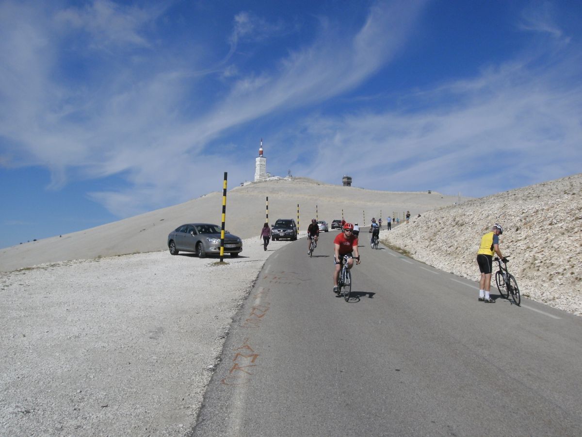 Schlagartig lichtet sich der Wald und man erreicht Le Chalet Reynard. Ein Blick, ungläubiges Staunen und alles bisher Gewesene ist Makulatur. Adrenalinschübe heben die Motivation und auf einmal geht´s auch mit dem Straßenbelag, denn hier trifft man auf die Straße von Bedoin kommend. Bekannt aus vielen Tour de France Übertragungen kommt von dort der schwierigste Aufstiegsweg. So bietet sich jetzt ein prachtvoller Blick auf den Gipfel. Der Rhythmus wird sofort gebrochen, denn gleich beginnen 7-7,5% Abschnitte und von nun an wird´s nur noch steiler. So richtig näher kommen will der Gipfel auch nicht und in diesen Momenten die sich ewig hinziehen fragt man sich zwar wieso mach ich das aber an´s Aufgeben wird nie ein Gedanke verschwendet. Auf dem Mond kann´s auch nicht anders aussehen. Von Vegetation keine Spur. Langsam geht´s voran doch beständig saugt man sich an den näherkommenden Kulminationspunkt heran. In Gedanken an viele TdF-Schlachten der Armstrong, Ullrich, Pantani und wie sie alle heißen kämpfst du dich voran. Leider gibt´s hier keine Zuschauer die dich anfeuern. Nicht jeder hat diesen Kampf gewonnen. Der englische Radprofi Tom Simpson brach am 13. Juli 1967 kurz vor dem Ziel zusammen und starb. Ihm zu Ehren ist ein Denkmal errichtet worden, an dem jeder Radfahrer ein Opfer bringen muss, damit er weiterhin Glück hat. Wir legten eine Rennradmütze vom „Team Haritz“ nieder.