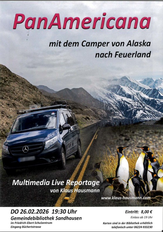 (geg – 6.2.26) 284 Tage, zwei Kontinente, ein Ziel: Klaus Hausmann berichtet am Donnerstag, 26. Februar, in der Gemeindebibliothek Sandhausen von seiner Reise entlang der Panamericana. Beginn ist um 19.30 Uhr, Einlass ab 19 Uhr. Der Eintritt kostet acht Euro.