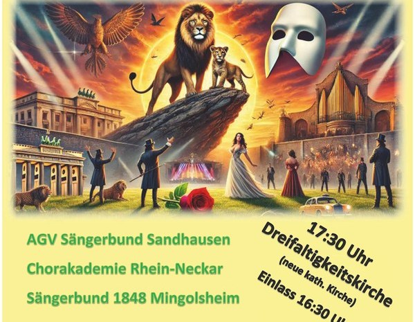 (pm – 3.10.25) Ein musikalischer Abend mit Werken, die längst Eingang gefunden haben in den Kanon der modernen Bühnenkunst: Der AGV Sängerbund Sandhausen, die Chorakademie Rhein-Neckar sowie der Sängerbund 1848 Mingolsheim gestalten gemeinsam ein festliches Konzert mit bekannten und beliebten Stücken aus der Welt des Musicals. Die musikalische Gesamtleitung liegt in den bewährten Händen von Gerhard Schramm, der auch die dramaturgische Konzeption verantwortet.