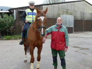 Mit dem Reitverein Leimen konnte sodann eine Kooperation beschlossen werden, die die Unterbringung der Pferde und die Schulung der Mitarbeiter der Stadtpolizei umfasste. Seit Anfang des Jahres wurden diese auf das neue Transport- und Einsatzsystem „Reitpferd“ eingewiesen und in der Bedienung geschult. Ende letzter Woche erfolgte die Abschlussprüfung, die der neue Chef der Reiterstaffel Uwe Kind mit Auszeichnung abschloss.