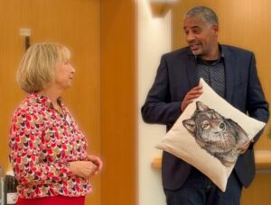 Die Vertreter der begünstigten Einrichtungen nahmen diese dankbar entgegen und machten deutlich, wie konkret die Unterstützung vor Ort wirkt. John Ehret, als OB der Stadt Leimen, würdigte in seinem Grußwort das langjährige Engagement und hob deren Bedeutung für das soziale Miteinander in der Stadt hervor. Hoch erfreut zeigte er sich über ein von Moni Fuhrich überreichtes Geschenk; ein tolles in der Gruppe hergestelltes Kissen.