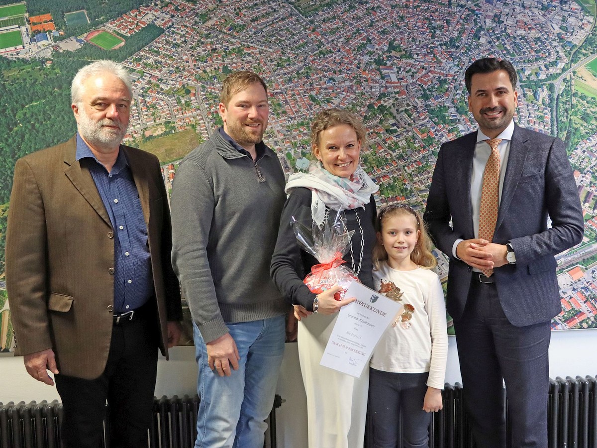 25 Jahre Öffentlicher Dienst: Bürgermeister Hakan Günes (r.) und Personalratsmitglied Peter Föhringer (l.) gratulieren Nina Schertz, die mit ihrem Mann Holger und Tochter Ella ins Rathaus gekommen war. Foto: Gemeinde Sandhausen