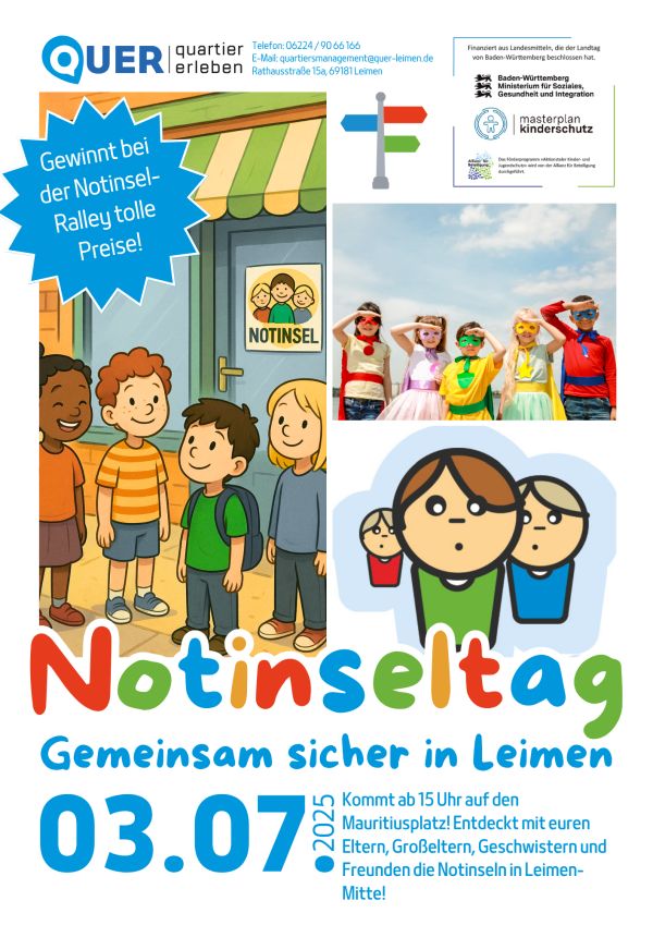 Der Notinseltag Leimen 2025 ist ein Aktionstag des Quer / Quartier-Managements rund um das Thema Kinderschutz. Im Mittelpunkt steht die sogenannte Notinsel – ein Projekt der Deutschen Kinderschutzstiftung Hänsel+Gretel. Geschäfte, Apotheken und Einrichtungen mit dem gelben Notinsel-Aufkleber signalisieren Kindern: „Hier bekommst du Hilfe, wenn du dich bedroht oder unsicher fühlst.“