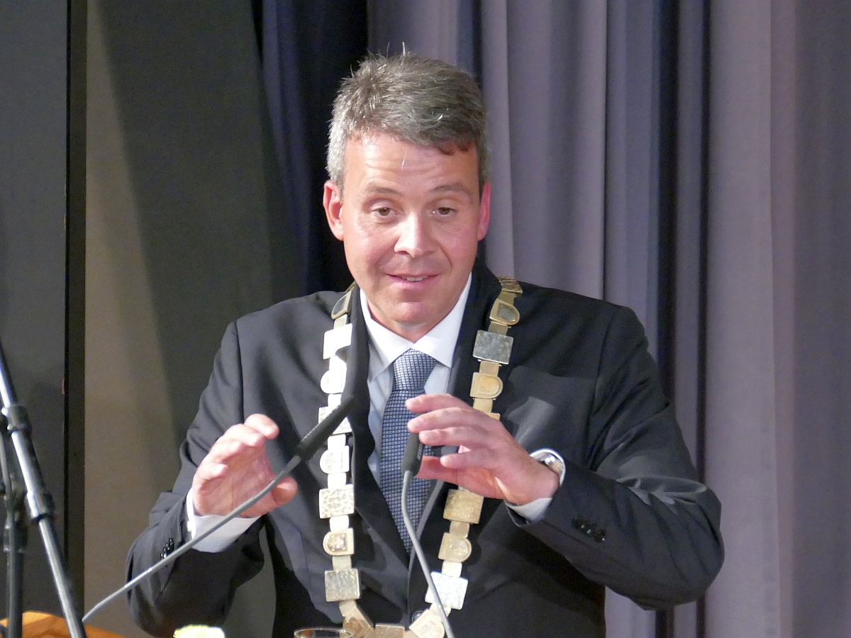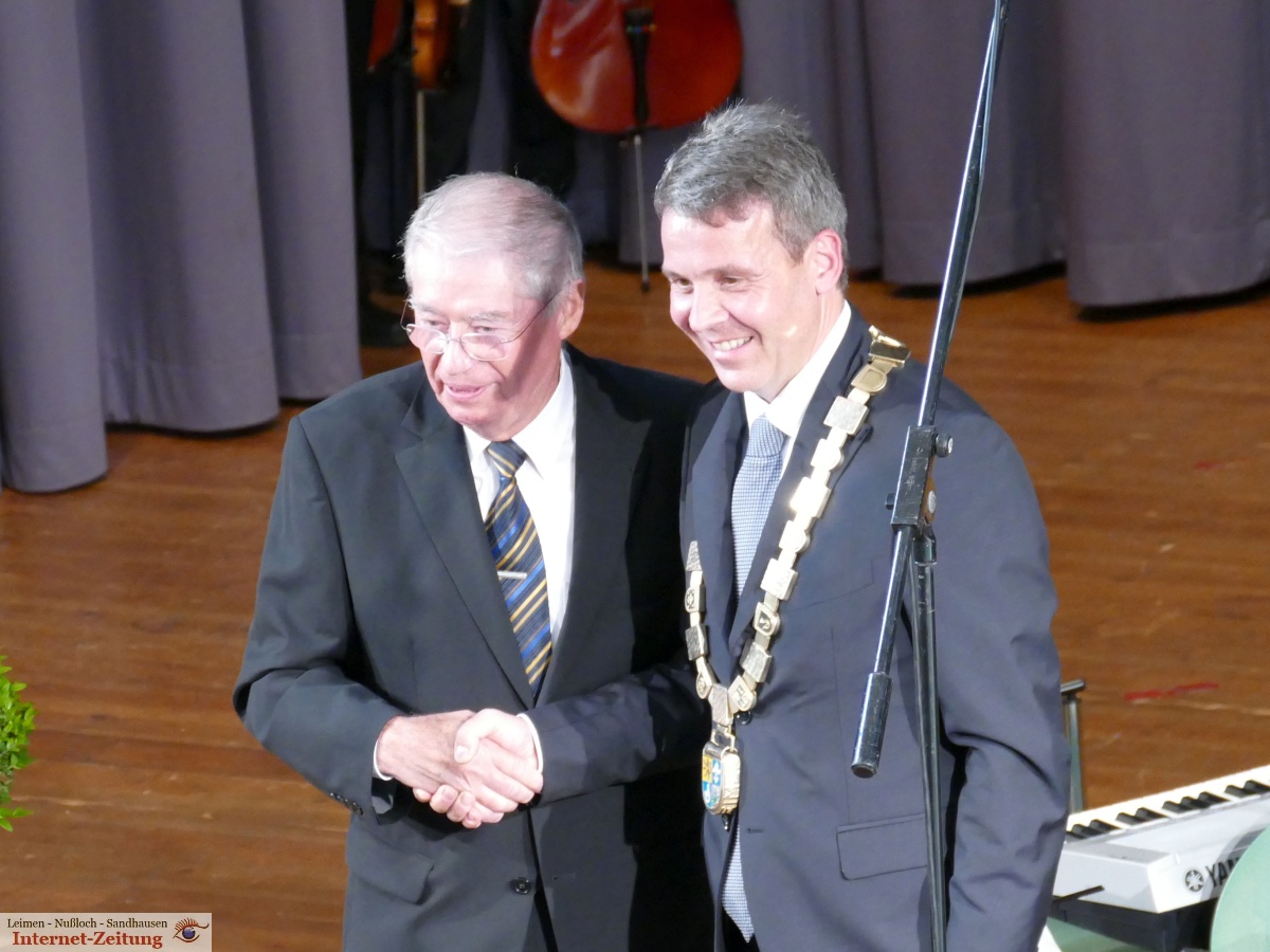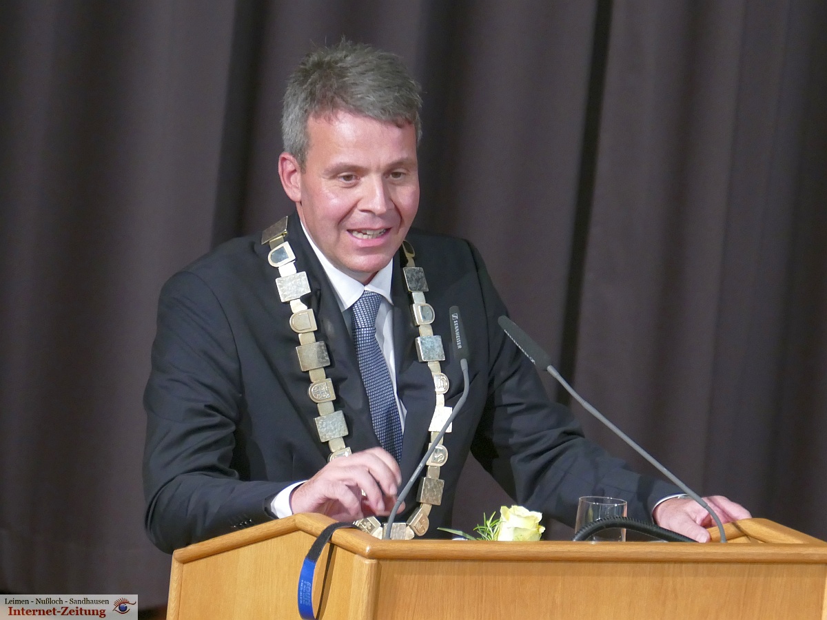 Hans Reinwald, erstmals mit der offiziellen Amtskette des Leimener Oberbürgermeisters geschmückt, bedankte sich in seiner Ansprache bei den Überbringern der Grußworte und fasste kurz die Leitlinien für seine künftige Amtsführung zusammen. Die vielfältigen Aufgaben können nur gemeinsam bewältigt werden und auch nur dann, wenn alle ein gemeinsames Ziel verbindet: die „Lust auf Leimen“, so Reinwald. Das Ziel müsse sein, Leimen weiter nach vorne zu bringen, es zu einem lebens- und liebenswerten Ort zu machen, in den man gerne kommt und in dem man gerne lebt. Leimen habe dieses Potenzial und er bitte alle um Unterstützung, dieses zu erwecken, neu zu beleben und zu erhalten.