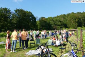 (fwu – 14.6.21) Wie sehr die seit eineinhalb Jahren geltenden Corona-Einschränkungen mit ihren Abstandsgeboten und Kontaktbeschränkungen den Menschen tatsächlich aufs Gemüt schlagen, konnte man am Samstag im Müllerschen Weinberg oberhalb Leimens sehen. Genaugenommen allerdings das Gegenteil: Fröhlichkeit und Heiterkeit auf allen Mienen, weil endlich wieder einmal ein Fest unter Menschen stattfinden konnte! Alleine diese Tatsache schien ausreichend, um eine gleichsam glückselige Stimmung zu erzeugen.