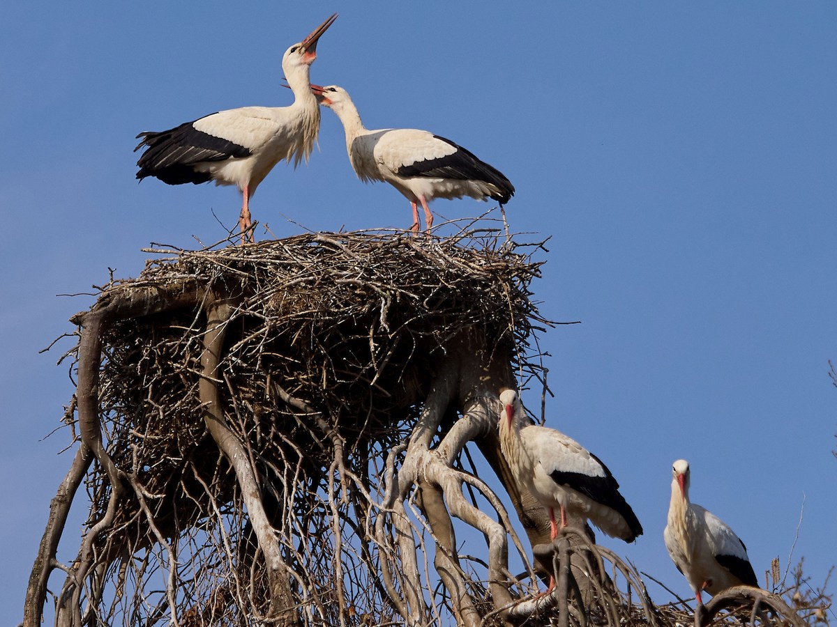 Zwischen bunten Tulpen, Hyazinthen und Osterglocken begegnen den Besuchern nicht nur Hühner und Schmetterlinge – das laute Klappern der Störche begleitet sie auf Schritt und Tritt. Viele der großen Vögel haben ihre Nester auf dem Gelände bezogen und sind mitten in der Brutsaison. Der Anblick der eleganten Tiere auf ihren kunstvollen Horsten, wie im dritten Bild festgehalten, ist ein Naturschauspiel mitten in der Stadt.