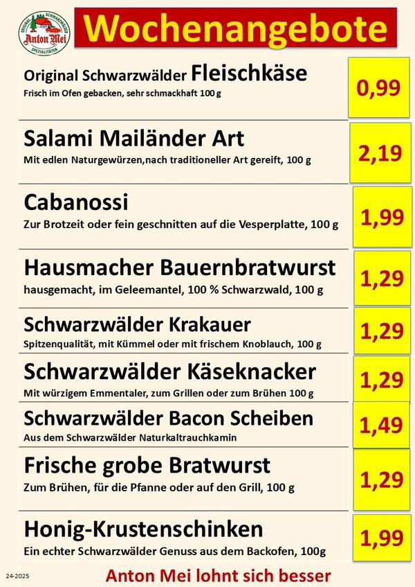 Original Schwarzwälder Fleischkäse, ofenfrisch: 0,99 € / 100 g- Salami Mailänder Art, nach traditioneller Reifung: 2,19 € / 100 g