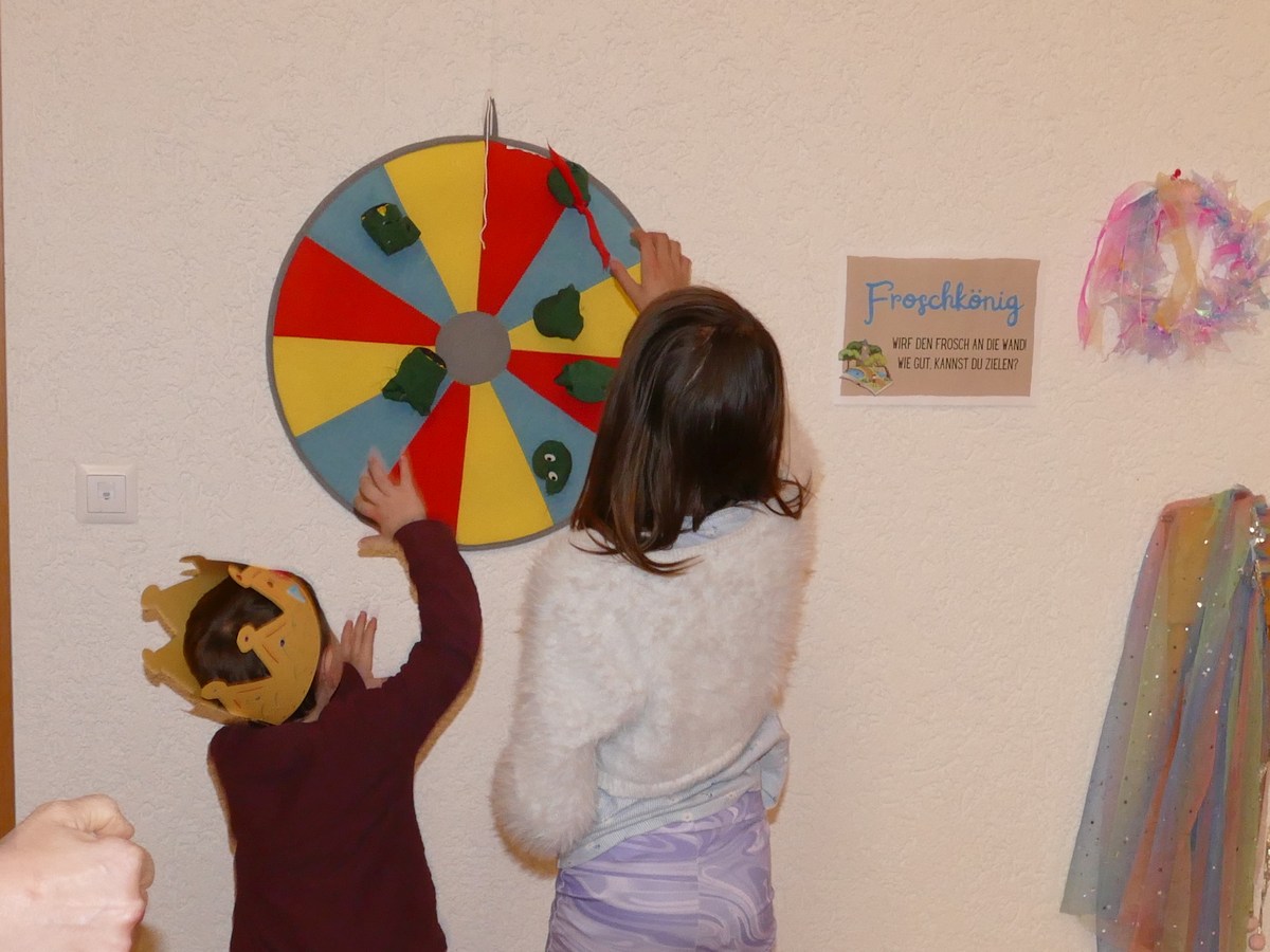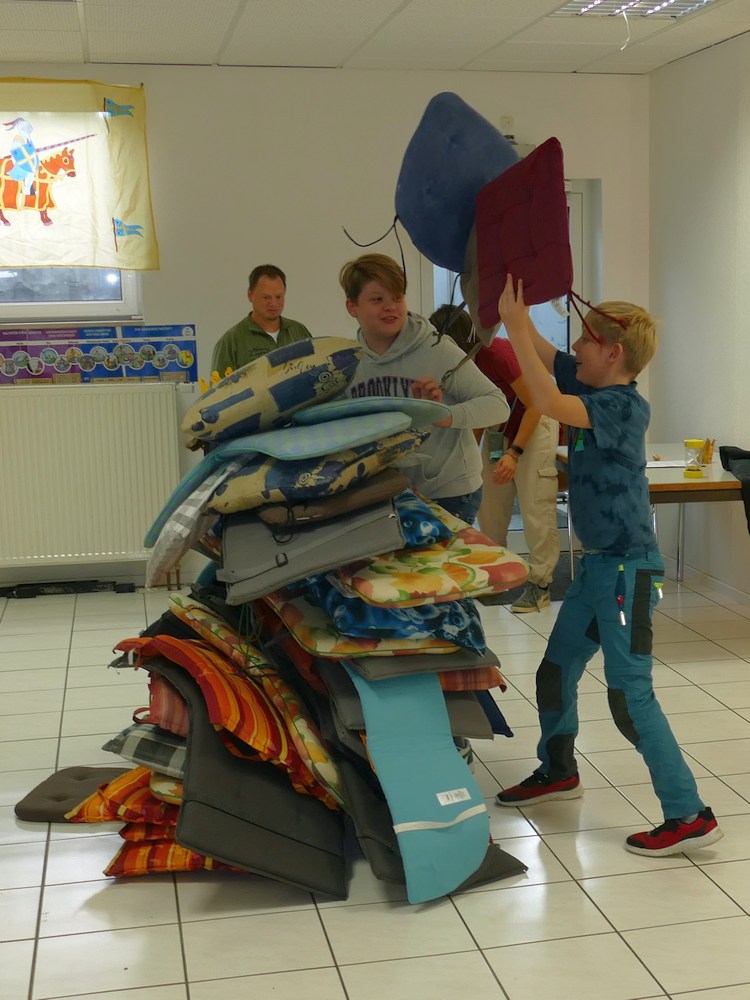 Die ausgewählten Märchen gehörten zu den bekanntesten der Gebrüder Grimm und waren: die Prinzession auf der Erbse, Sterntaler, Aschenputtel, Dornröschen, Schneewittchen, Rapunzel und Tischlein deck dich. Und zu jedem Märchen gehörte eine passende Spielaufgabe, deren Gestaltung von handwerklich aufwändig bis simpel reichte. Wobei „simpel“ durchaus viel Spaß machen kann! Die Aufgabe bei der Prinzession auf der Erbse bestand darin, möglichst viele Kissen und Sitzbezüge auf der Erbse zu einem Turm aufzuschichten. Wer den höchsten Turm schafft, gewinnt! Einfaches Material aber eine schwierige Aufgabe und gerade deswegen auch so spaßig. Hier machten sogar die größeren Kinder mit Begeisterung mit.