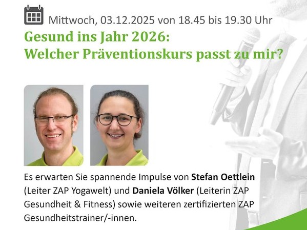 Los geht’s um 18.45 Uhr im ZAP. Neben den beiden ZAP-Leitungen geben auch weitere zertifizierte Gesundheitstrainerinnen und -trainer einen Einblick in ihr Kursangebot. Kein Fachchinesisch, sondern klare Tipps aus der Praxis. Der Eintritt ist frei.