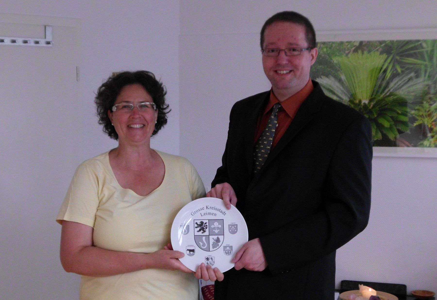 Leimens Wirtschaftsförderer Frank Timmers überreichte Frau Paulitz den traditionellen Wappenteller der Großen Kreisstadt Leimen und wünscht auch im Namen der Stadtverwaltung zur Eröffnung nachträglich alles Gute.