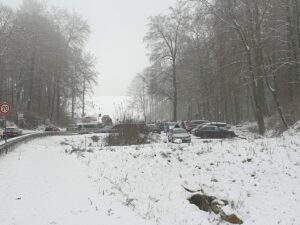 Nach den ergiebigen Schneefällen der vergangenen Nacht waren in den höhergelegenen Touristenregionen rund um den Königstuhl, insbesondere in den Bereichen Ziegelhausen und Wilhelmsfeld, aber auch in Neckargemünd und Leimen, die dortigen Parkplätze bereits ab 11:00 Uhr nahezu ausgelastet und die jeweiligen Rodelhänge durch Familien und Wintersportler stark frequentiert.