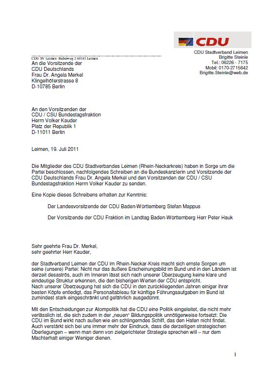 Das Schreiben der CDU Leimen an Angela Merkel