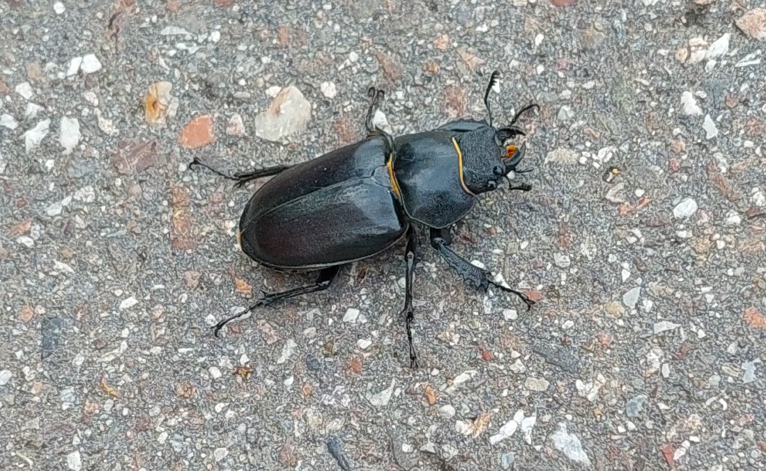 (geg – 9.6.25) Man kennt sie eigentlich nur aus Naturkundebüchern o der als geschnitztes Zierwerk im Försterhaus: die sagenumwobenen Hirschkäfer, lateinisch Lucanus cervus. Doch wer dieser Tage im Hardtwald unterwegs ist, der hat gute Chancen, einem dieser urzeitlich anmutenden Brummer leibhaftig zu begegnen – wie der männliche Käfer im ersten Bild, entdeckt in einem mit Laub gefüllten Gartenkorb, oder seine stattliche Partnerin, die am Radweg in Walldorf gemächlich ihre Runden drehte.