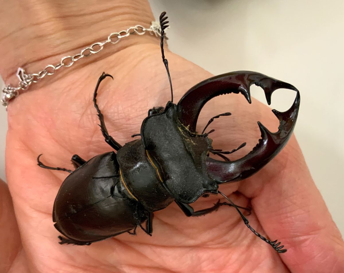 Männlicher Hirschkäfer mit prächtigem „Geweih“, entdeckt in einem Gartenkorb nahe des Hardtwaldes (Foto: C. Kienle)