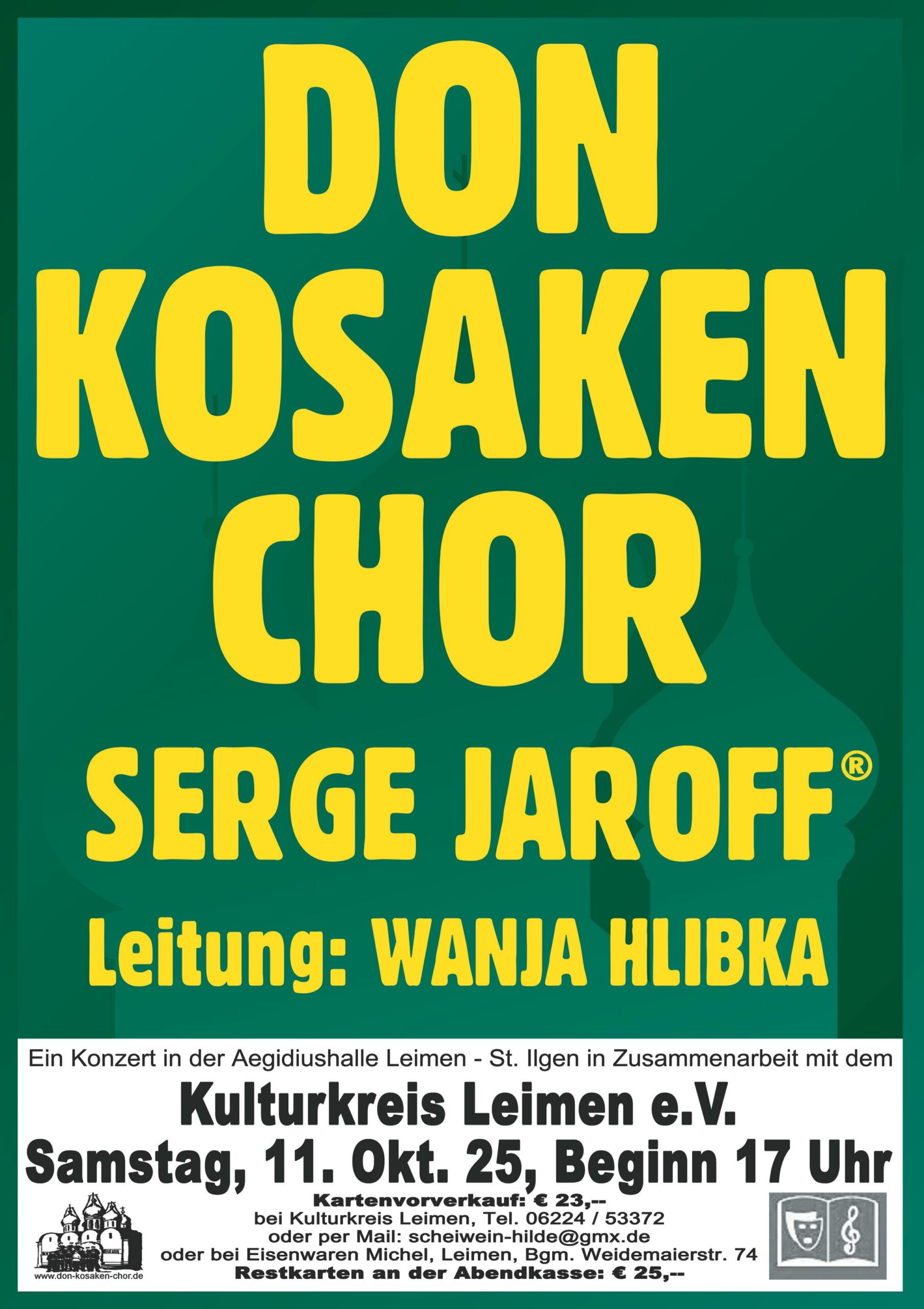 (fwu – 20.8.25) Der Don Kosaken Chor Serge Jaroff gastiert am Samstag, 11. Oktober 2025, um 17 Uhr in der Aegidiushalle Leimen – St. Ilgen. Unter der Leitung von Wanja Hlibka, selbst einst Solist des legendären Original-Ensembles, verspricht der Abend nicht weniger als: Stimmgewalt, Pathos und russische Seele pur.