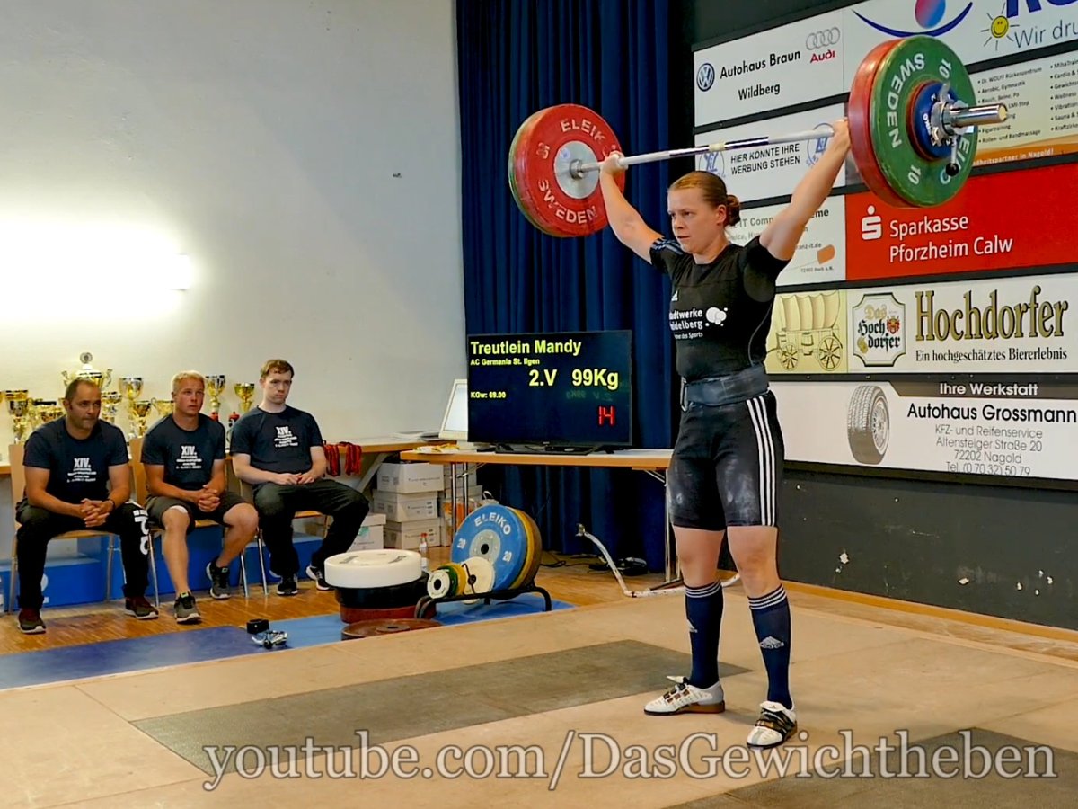 Auch Mandy Treutlein ging selbstbewußt ins Turnier und mit 3 gültigen Versuchen schaffte sie es auf Anhieb, ihren eigenen deutschen Rekord bereits im 2. Versuch um 1 kg auf nunmehr 99 kg zu steigern. Ein super Einstand, dem dann allerdings äußerst unglückliche Versuche im Stoßen folgten. Ohne gültigen Versuch mußte sie die 2. Disziplin und somit ein gültiges Zweikampfergebnis beenden. Der sicher geglaubte Gesamtsieg wurde so leider verpaßt.