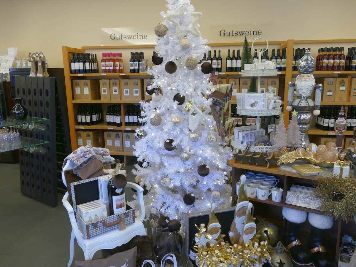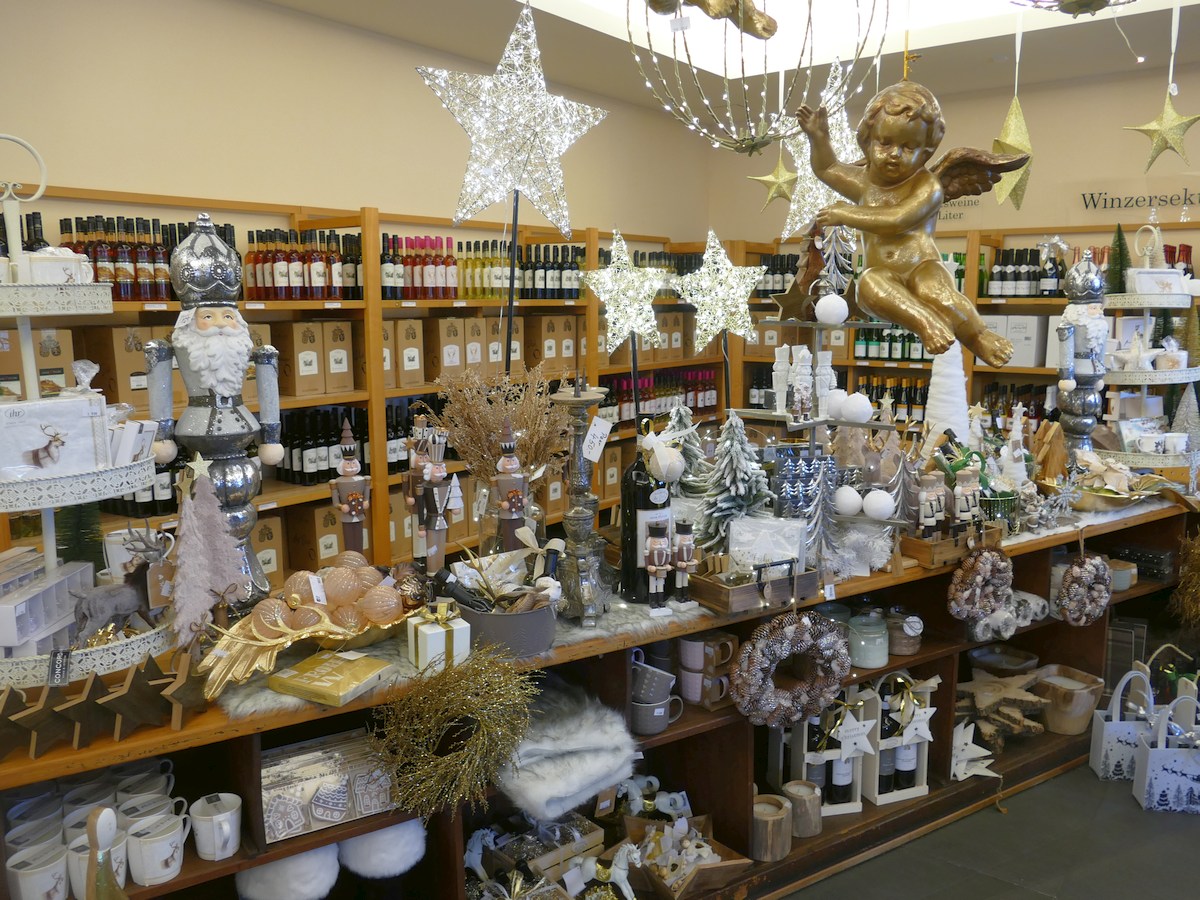 Der vordere Teil der Vinothek zeigte sich wie jedes Jahr festlich geschmückt: Ein weißer Weihnachtsbaum, Geschenkideen, Weinpräsente, Kunsthandwerk und Dekoartikel. Wer noch auf der Suche nach etwas zum Verschenken war, wurde hier fündig. Die Deko: mal klassisch mit Kerzen und Windlichtern, mal überraschend mit Polarbären, alten Skiern und übergroßen Zuckerstangen. Die passenden Trends holt sich Nathalie Müller jedes Jahr frisch von der „Christmasworld“ in Frankfurt.