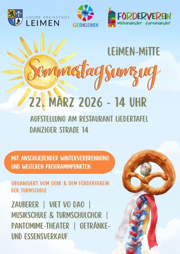 (3.3.26 – np) Der Frühling hält Einzug in Leimen: Am Sonntag, dem 22. März 2026 findet der traditionelle Sommertagsumzug statt, der mit Musik und guter Laune den Frühling in die Gemeinde bringt.