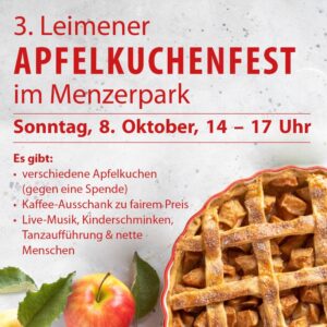 (5.10.23) Am Sonntag, dem 8. Oktober, ist es soweit! Dann steigt das dritte Leimener Apfelkuchenfest im Menzerpark. Zwischen 14 und 17 Uhr wird es hoffentlich viele leckere Apfelkuchen zum Schlemmen und Genießen geben.