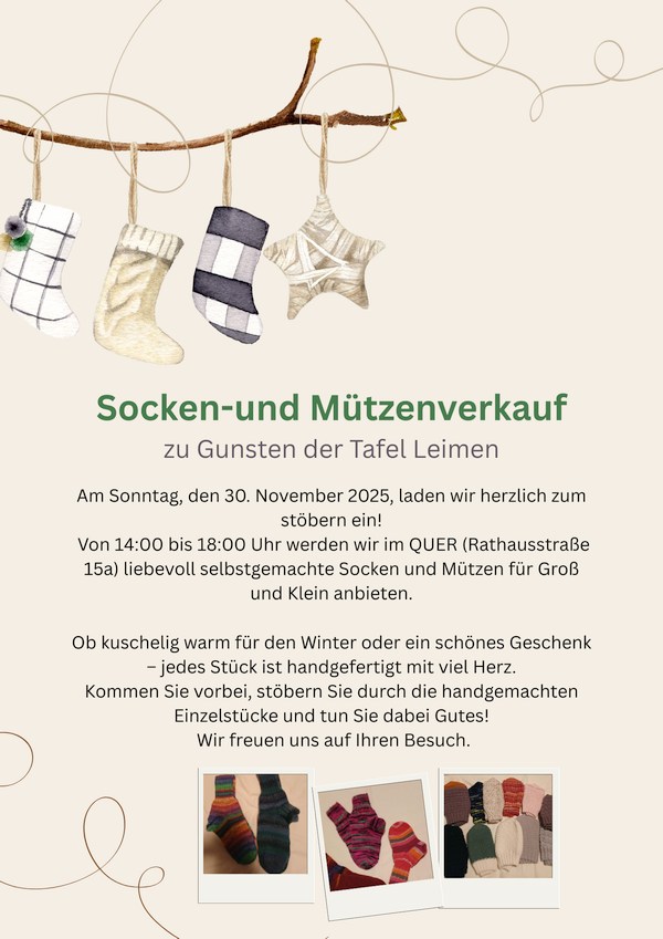 (fwu – 28.11.25) Wärmendes für kalte Tage – und für einen guten Zweck. Am kommenden Sonntagwird’s im Leimener „QUER“ (Rathausstraße 15a) gemütlich: Von 14 bis 18 Uhr findet dort ein besonderer Verkauf statt. Angeboten werden handgestrickte Socken und Mützen – jedes Stück ein Unikat, mit Sorgfalt und Herz gefertigt.