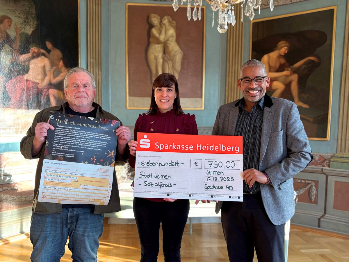 (pm – 19.12.25) In der Vorweihnachtszeit, in der Solidarität und Mitmenschlichkeit eine besondere Bedeutung haben, konnte Oberbürgermeister John Ehret am 17. Dezember 2025 eine erfreuliche Unterstützung für den Weihnachts- und Sozialfonds der Stadt Leimen entgegennehmen. Patricia Jäckel, Regionalleiterin der Sparkasse Heidelberg Region Leimen-Nußloch, überreichte einen Scheck in Höhe von 750 €.