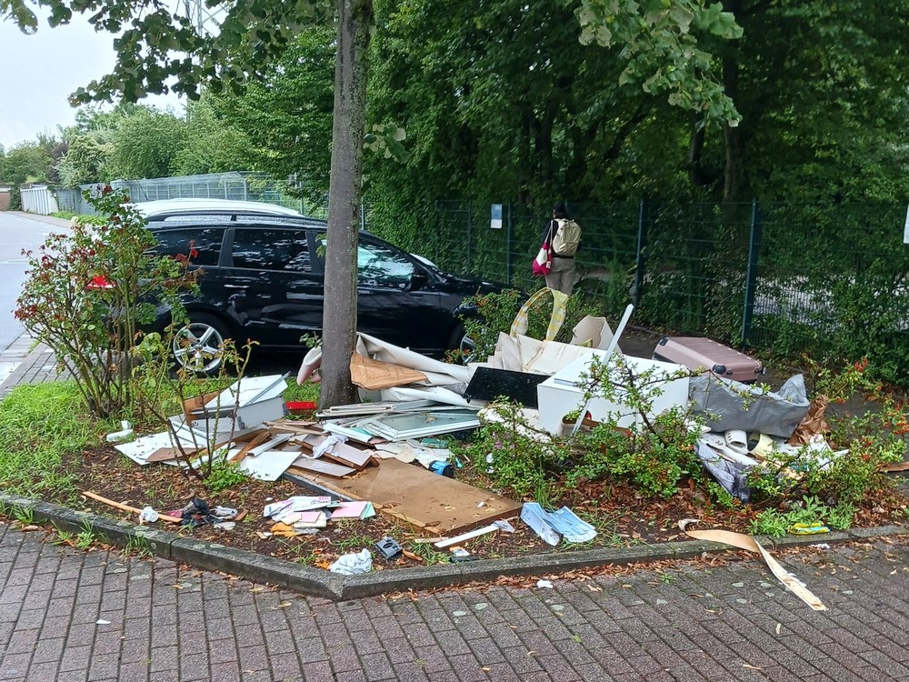 Unrat und Sperrmüll am Fahrbahnrand einer Grünfläche nahe eines abgestellten Fahrzeugs