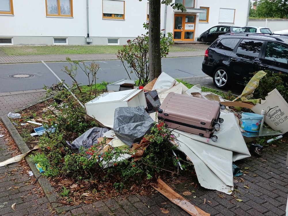 Haufen aus Möbelresten, Koffer und Müllsäcken in einem Wohngebiet