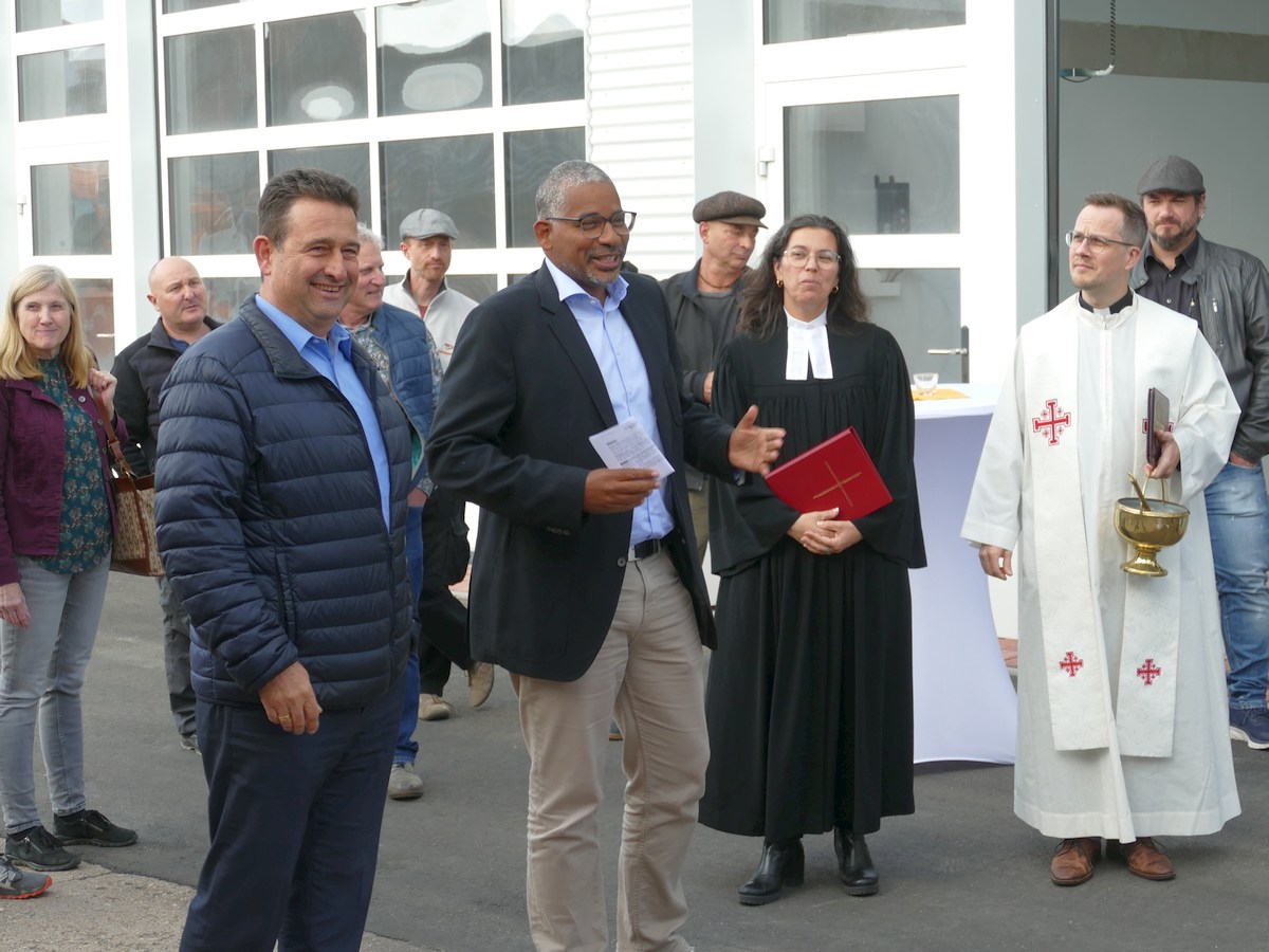 Der Hof füllte sich, der Grillstand von Horst Kräher bereitete sich auf die kommenden Gäste vor. „Feuerwurst“ stand über den Platten, dazu Steaks mit Zwiebeln – kein Schickimicki, sondern der richtige Snack für Leute, die arbeiten. Die evangelische Pfarrerin Natalie Frey und der katholische Geistliche Georg Henn sprachen den Segen. So ein Moment tut einem Zweckbau gut: einmal durchatmen, bevor der Alltag endgültig einzieht.