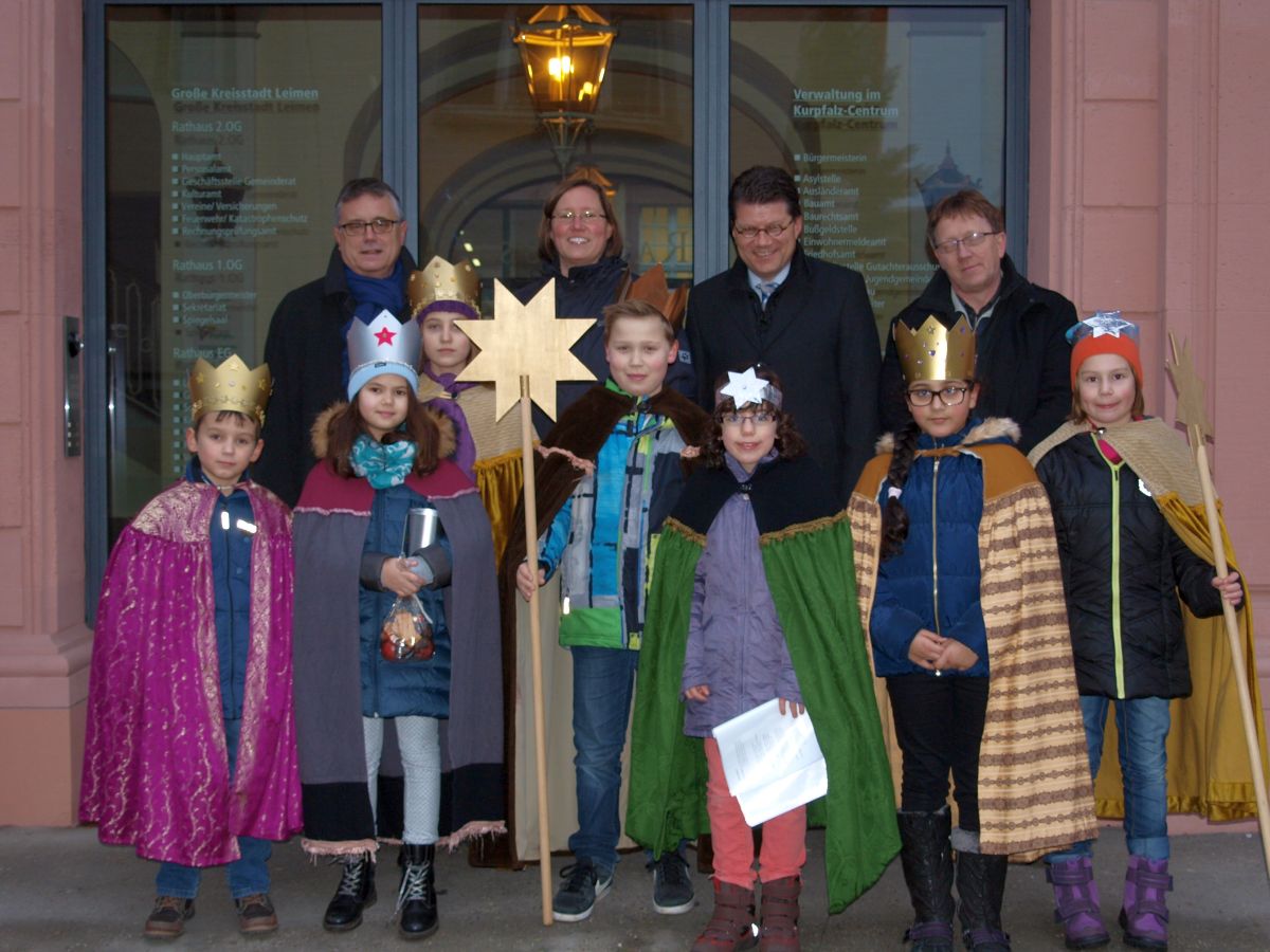 (rm) Traditionell besuchten auch in diesem Jahr wieder die Sternsinger das Leimener Rathaus, um auch hier für Kinder, die in aller Welt Not leiden, Spenden zu sammeln. Jedes Jahr in der ersten Januarwoche machen sich über 20.000 Kinder und Jugendliche in der Erzdiözese Freiburg (in ganz Deutschland sogar 500.000) auf den Weg von Haus zu Haus: Bei der größten Solidaritätsaktion der Welt singen die Sternsinger für bedürftige Kinder.