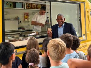 (18.07.2025 np) Am Mittwoch, dem 16. Juli, bekamen die Viertklässler der Geschwister-Scholl-Schule in St. Ilgen besonderen Besuch. Oberbürgermeister John Ehret kam persönlich vorbei und brachte eine süße Überraschung mit: für jedes Kind gab es eine Kugel Eis. Ein eigens dafür organisierter Eiswagen des Park Café St. Ilgen machte auf dem Schulhof Halt und sorgte trotz des regnerischen Wetters für strahlende Gesichter.