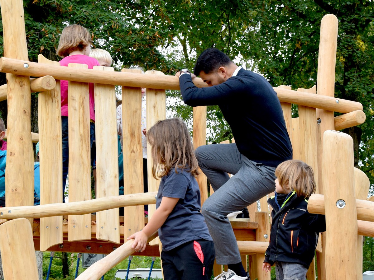 Nach der offiziellen Freigabe durfte alles sofort ausgiebig getestet werden. Die Freude war riesig – jedes Kletterelement wurde auf Herz und Nieren geprüft. Auch Bürgermeister Hakan Günes ließ sich diesen Spaß nicht nehmen: Mutig wagte er sich auf die Wackelbrücke und die Rutschstange. Sein letzter Sprung an eine Rutschstange läge gut und gerne 20 Jahre zurück. „Die Kinder machen das definitiv besser als ich, aber ich bin stolz, dass ich alles heil überstanden habe“, scherzte er lachend. „Wir freuen uns sehr, diesen Ort für Kinder und Familien durch die Umbaumaßnahmen attraktiver gestaltet zu haben“, so Günes weiter.