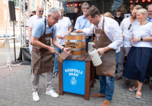 Kein Tropfen ging beim Fassanstich von Landrat Stefan Dallinger und Welde-Chef Max Spielmann daneben – die Führungsriege des Rhein-Neckar-Kreises (im Hintergrund v. l. Ulrich Bäuerlein, Rudolf Fickinger, Dr. Christopher Leo, Doreen Kuss und Ralf Schmidt) können es bezeugen