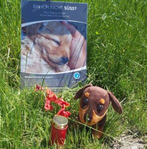 Wer an dem Tag am Tierheim vorbeilief oder mit dem Fahrrad vorbeifuhr, sah schon aus der Ferne, dass am Straßenrand Holzkreuze aufgestellt waren. Kam man näher, sah man an jedem Kreuz ein Kuscheltier, ein Grablicht und ein Plakat. Unwillkürlich bekam man einen Schreck.