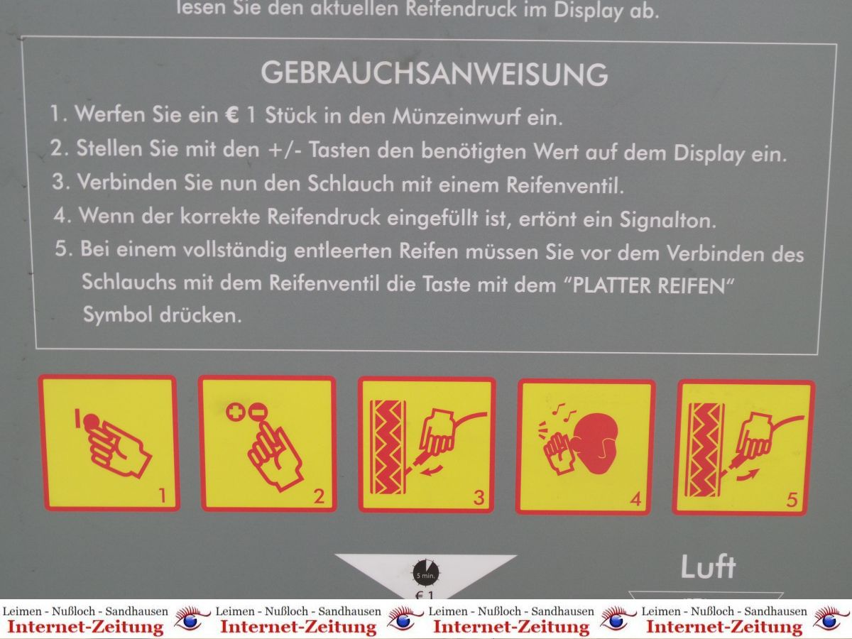 Seit einigen Wochen gibt es übrigens bei Shell in Leimen noch einen besonderen „Kundenservice“: Die Luftdruckmessung kostet dort 1,- Euro extra! Auch solche Aspekte sollte man bei der Wahl seiner Tankstelle berücksichtigen. Bei Esso in Leimen ist das Gerät zwar „antik“, tut aber seine Pflicht und ist kostenfrei.