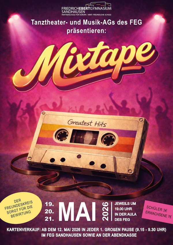 Karten gibt es ab dem 12. Mai 2026 in jeder 1. großen Pause im FEG (d.h. von 9.15 bis 9.30 Uhr) sowie an der Abendkasse. Schülerinnen und Schüler zahlen 3,- Euro und Erwachsene 7,- Euro.