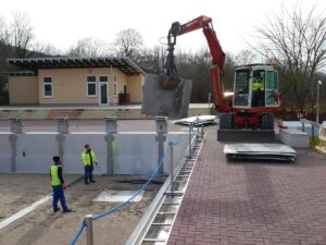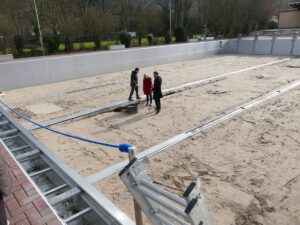 In der vergangenen Woche begann der Rückbau. Fünf Arbeiter standen über zehn Stunden täglich im Becken und trennten den alten Stahlboden mit der Flex heraus. Zwei volle Tage dauerte allein dieser Schritt. Nun folgen die Kanäle und die alte Drainage. Alles wird ausgebaut. Danach entsteht eine neue Drainage als Grundlage für den neuen Stahlboden.