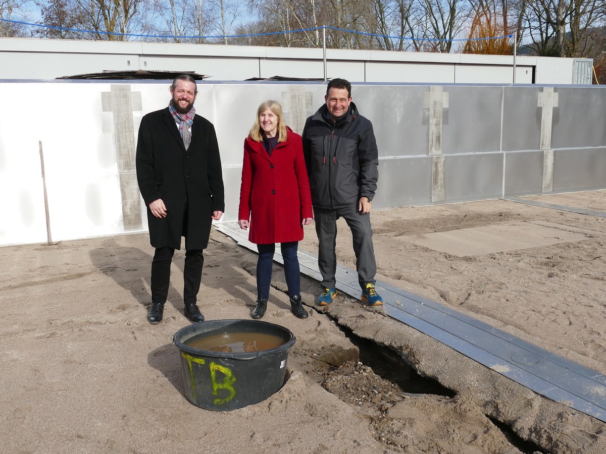 Rund 600.000 Euro kostet die Reparatur. Etwa 50.000 Euro übernimmt die Versicherung. Den überwiegenden Teil trägt also die Stadt. Bürgermeisterin Claudia Felden zeigte sich bei einem Ortstermin am 17. Februar zuversichtlich, dass der Zeitplan hält. Neben ihr erläuterten Rudi Kuhn und der stellv. Betriebsleiter Tobias Hornisch die einzelnen Schritte. Recycelt wird, was wiederverwendbar ist. Kies und Sand bleiben erhalten. Stahl wird fachgerecht entsorgt.