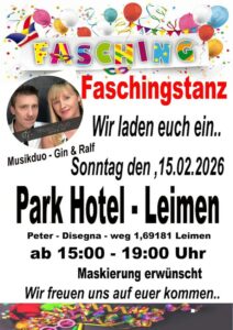 Deutschlands Toptalente U12 / U14 – Tennis-Landesleistungszentrum Jahnstraße 4, Leimen. 69181 LeimenEintritt frei Faschingstanz im Parkhotel / Der Spanier 15.00 – 19.00 Uhr – Musik von Gin & Ralf |